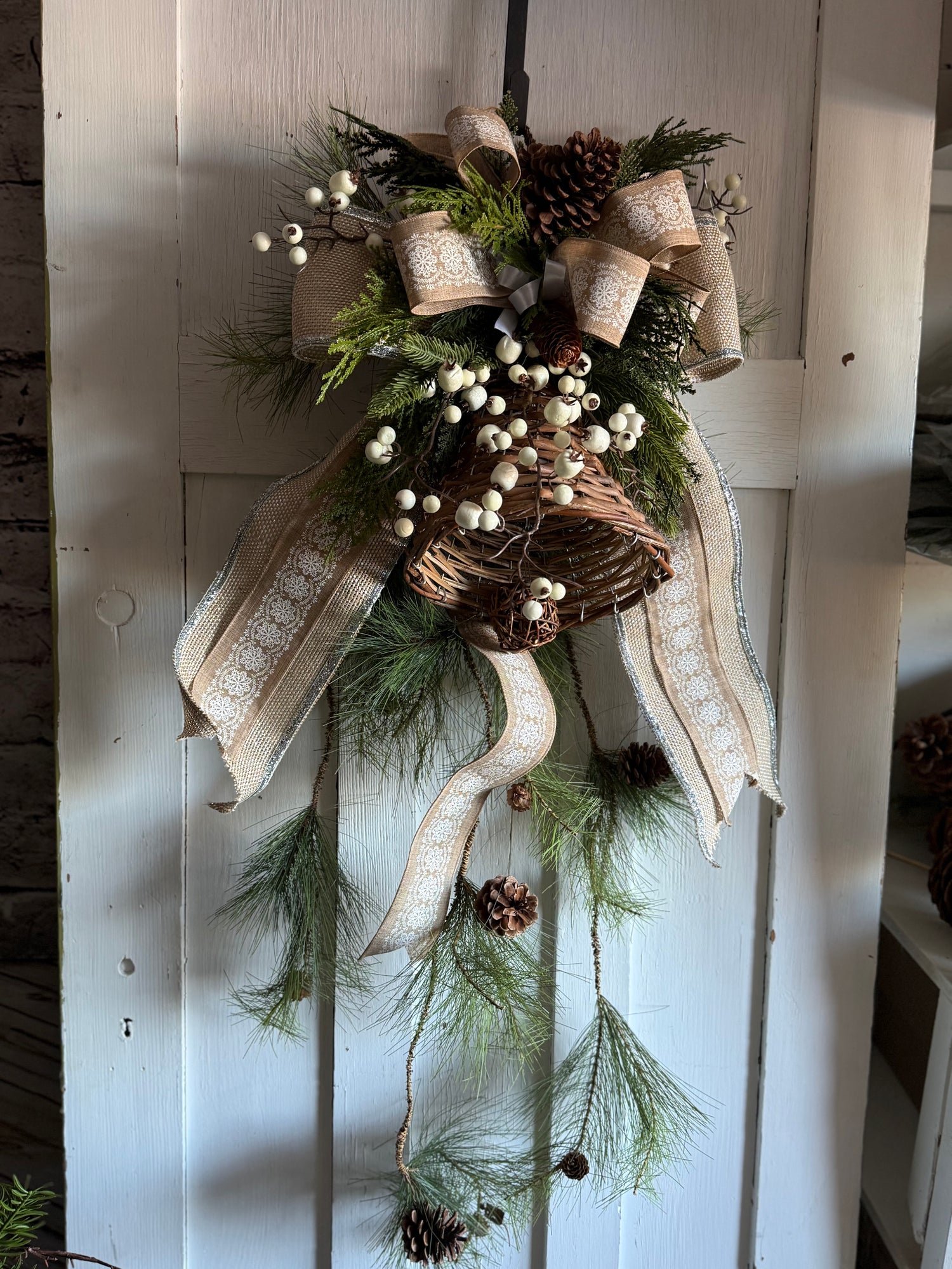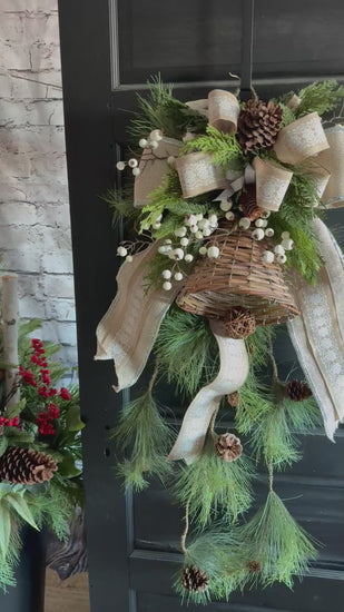 Introducing the Bell Door Swag - the perfect addition to your winter and Christmas decor. Crafted with extra length for a unique look, this swag features pine, cones, cream berries, and a large rattan bell. The striking bow adds a festive touch. Measuring at 34" x 14", it's sure to make a statement on any door.