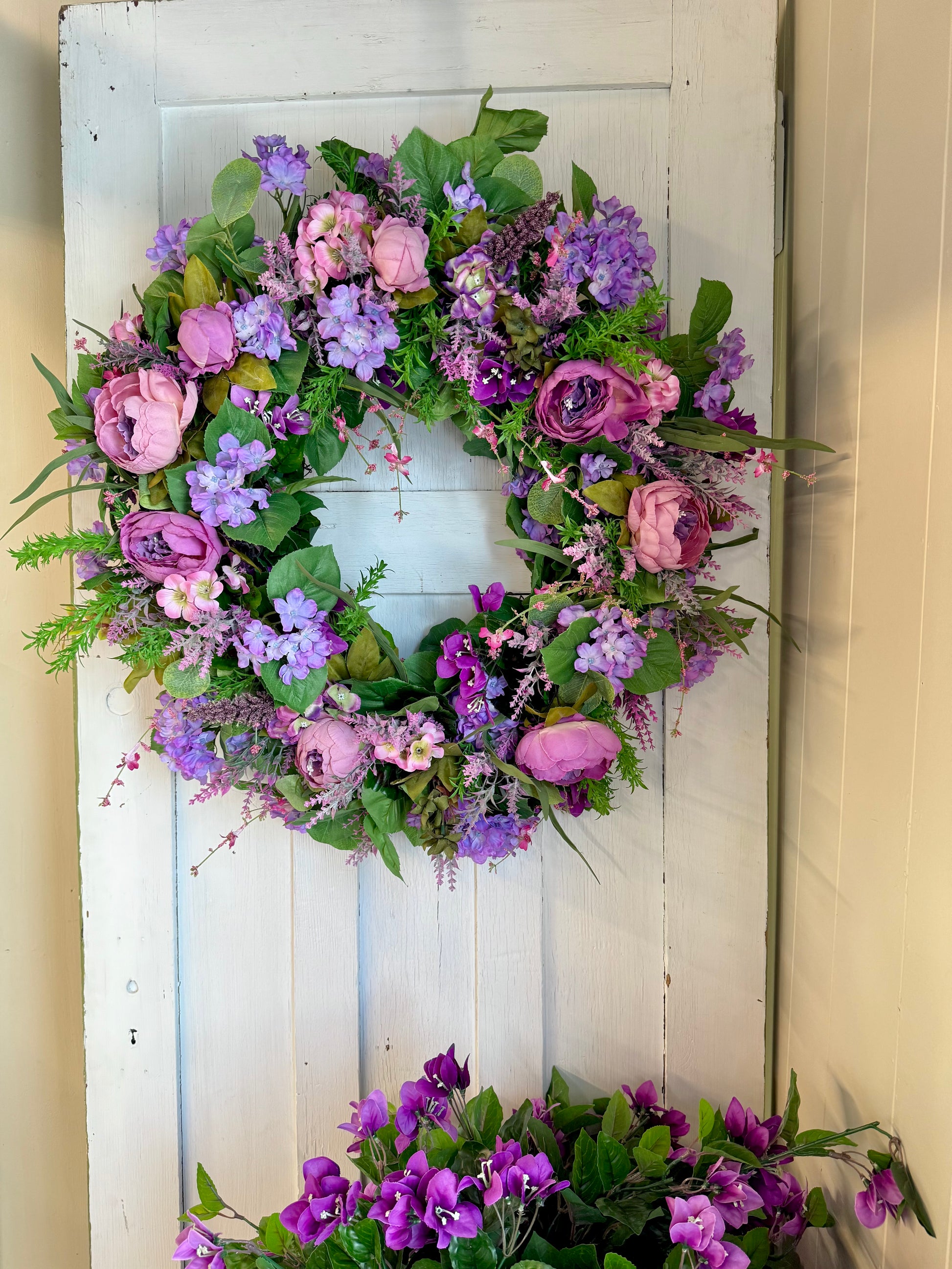 The Blooming Spring Wreath measures 27 inches and features an arrangement of extra large peonies, hydrangeas, and roses in vibrant shades of purple and pink, complemented by lush greenery. This design enhances aesthetic appeal and provides a refreshing entrance or decoration, promoting a lively atmosphere in any space.