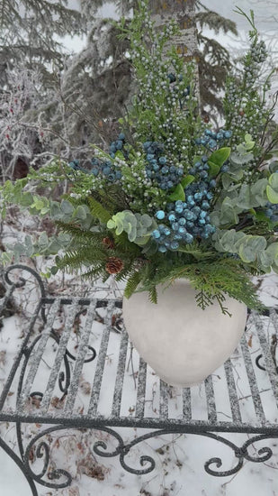 "Enhance your home with the stunning Blueberry Juniper Vase Arrangement. This large faux arrangement features lifelike blueberries, faux greenery such as Juniper, Spruce, and eucalyptus, all arranged flawlessly in a beautiful ceramic vase. Measuring 30 inches, this arrangement adds a touch of natural beauty and elegance to any room."
