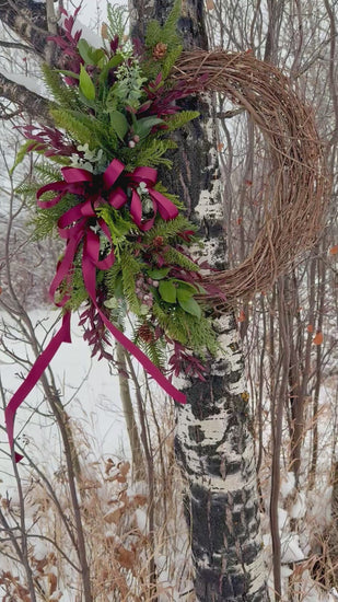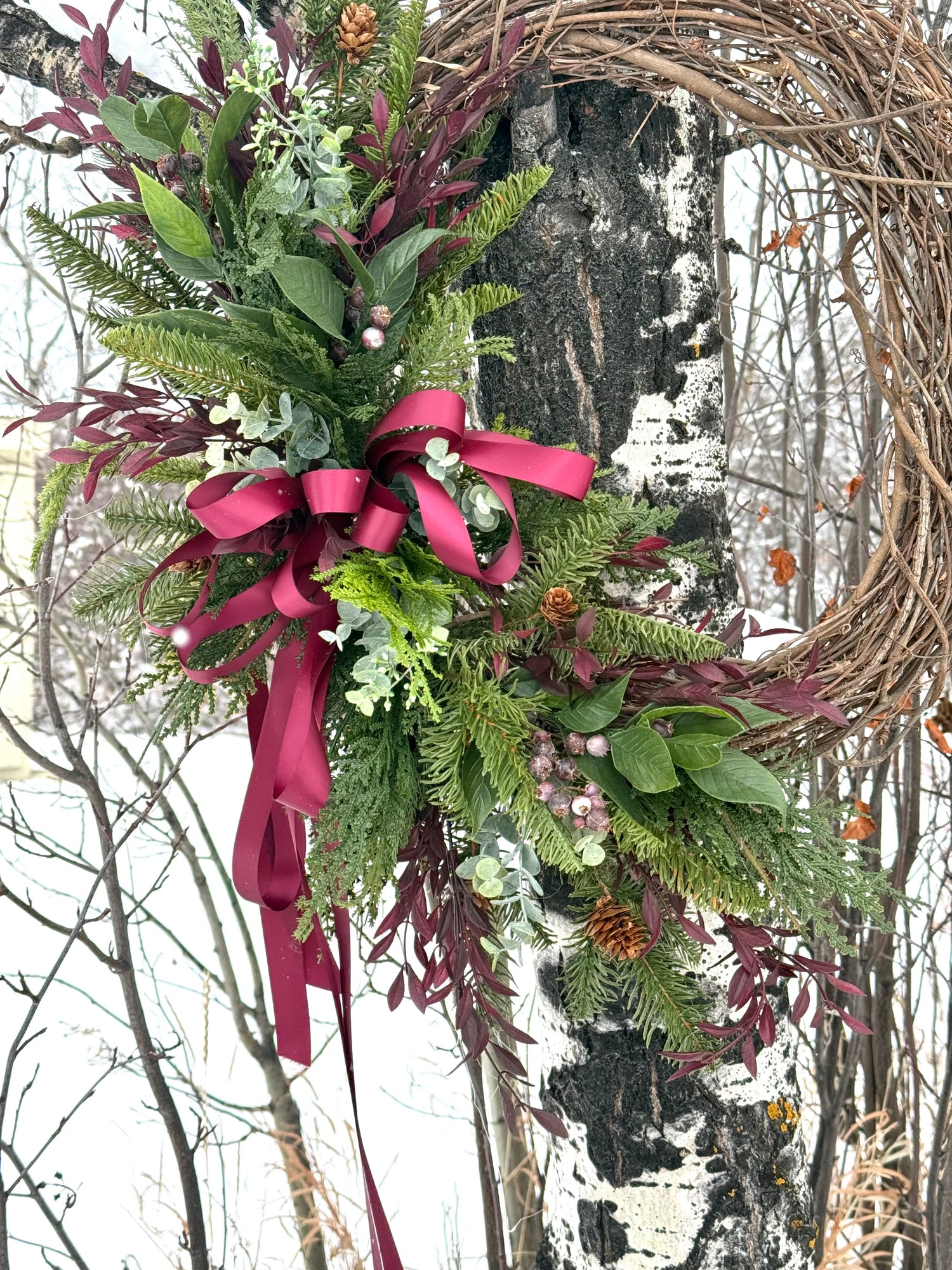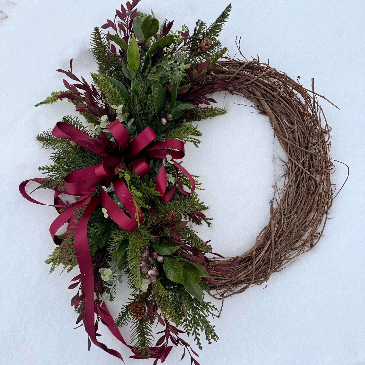 Introducing our luxurious Burgundy Satin Bow Wreath, featuring a hand-tied burgundy satin bow on a wreath adorned with real touch greenery magnolia leaves. Measuring 30x18" wide, this wreath adds a touch of elegance and sophistication to any space. Elevate your décor with this stunning wreath today.