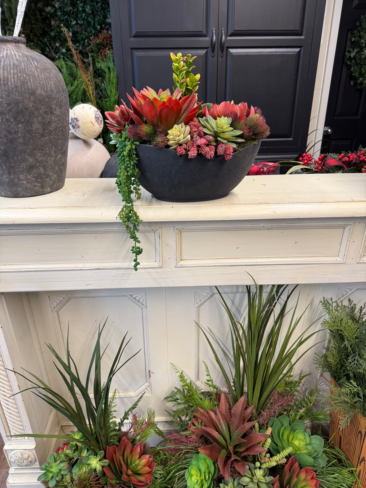 This Red Succulent Arrangement boasts shades of rust and red, accented by lush green leaves. Standing at 20 inches tall and housed in a sleek black container, this stunning arrangement is a must-have for any décor. Bring a touch of nature into your space with this expertly crafted succulent display.