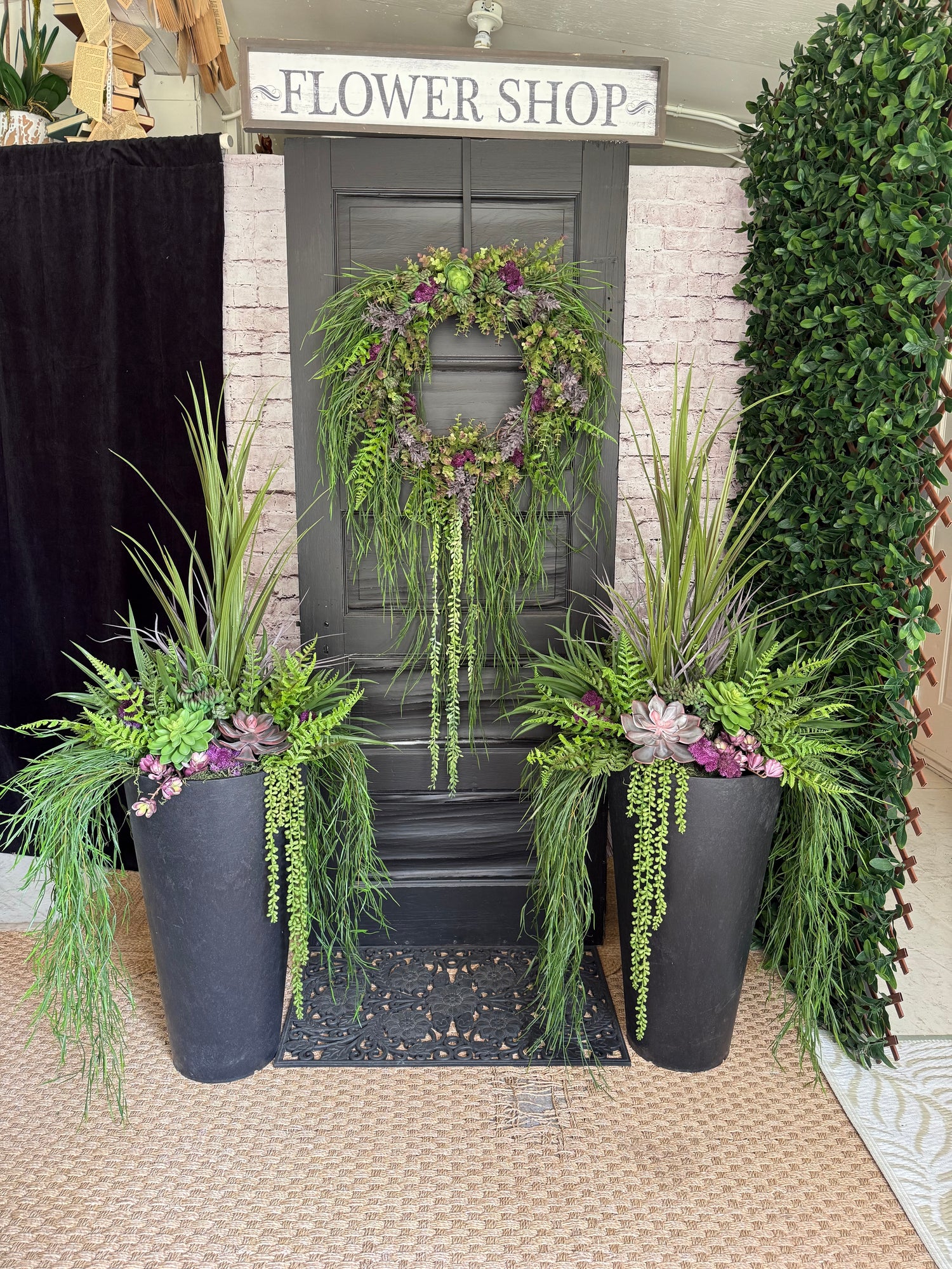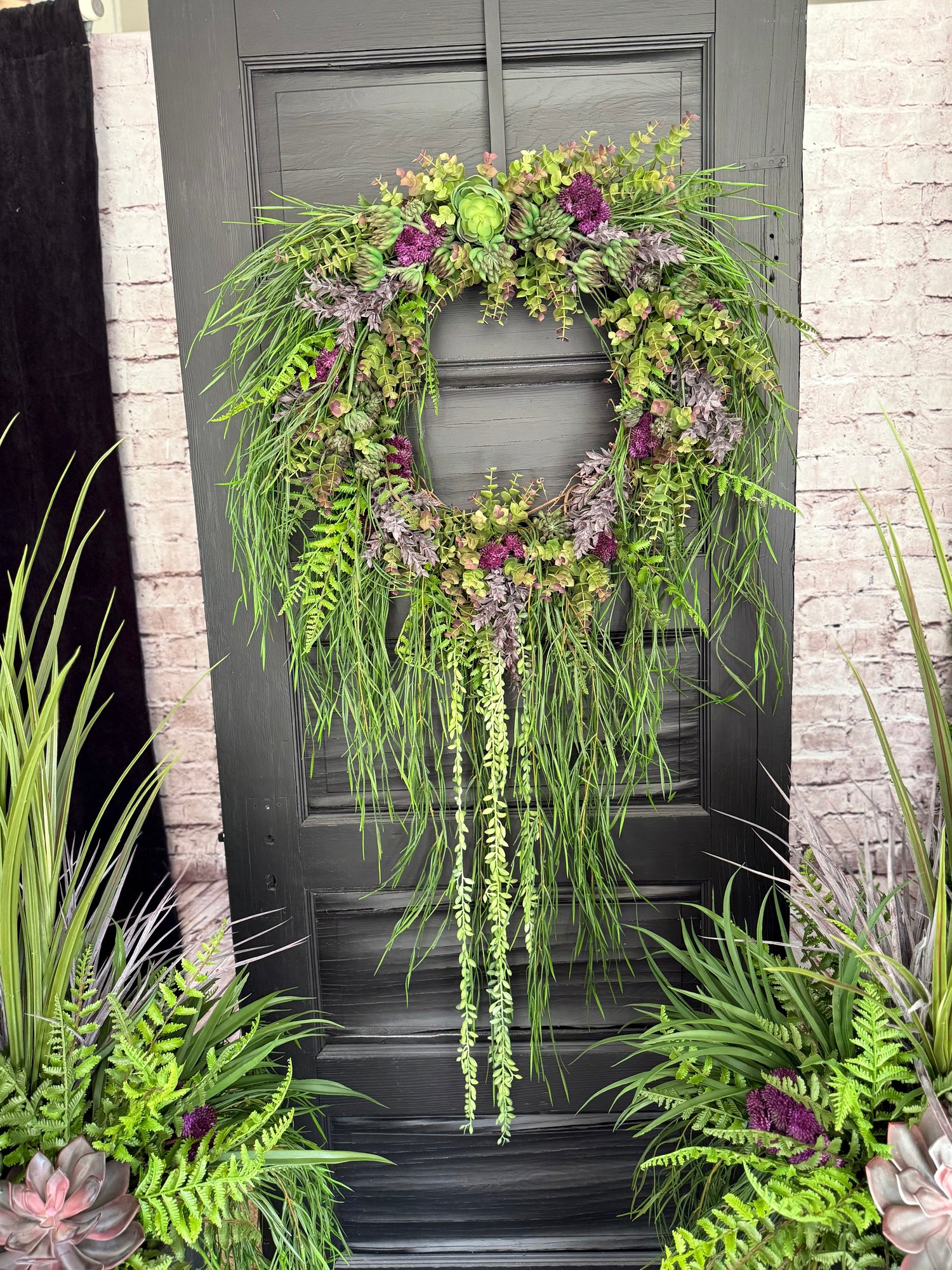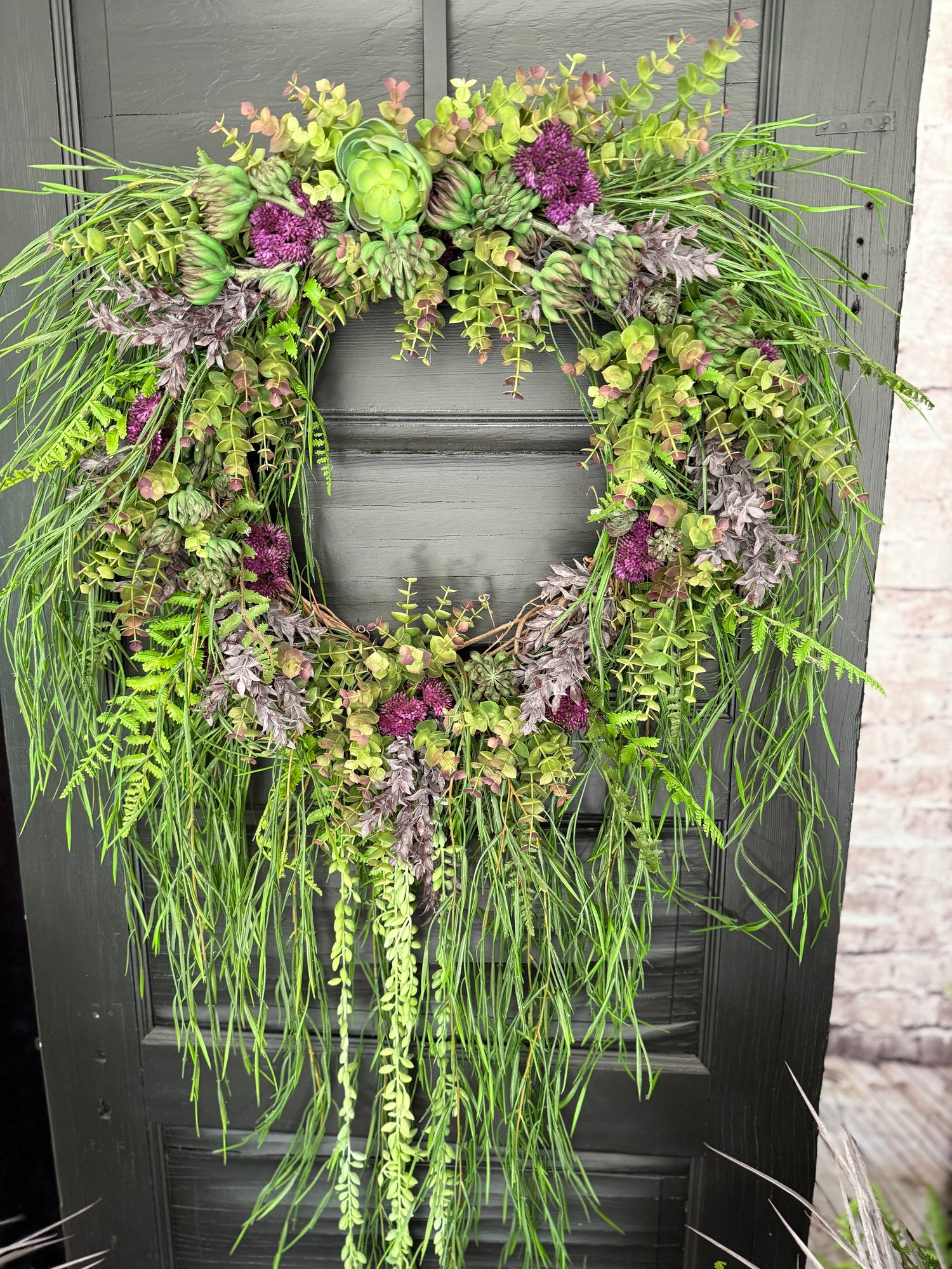 This modern greenery wreath measures 34” x 24” and is a versatile addition to any home decor. Made with high-quality materials, it adds a touch of elegance to any entryway or wall. The perfect way to bring nature indoors and elevate your space. Made with artificial hanging grasses, ferns and succulents in vibrant green and purple.