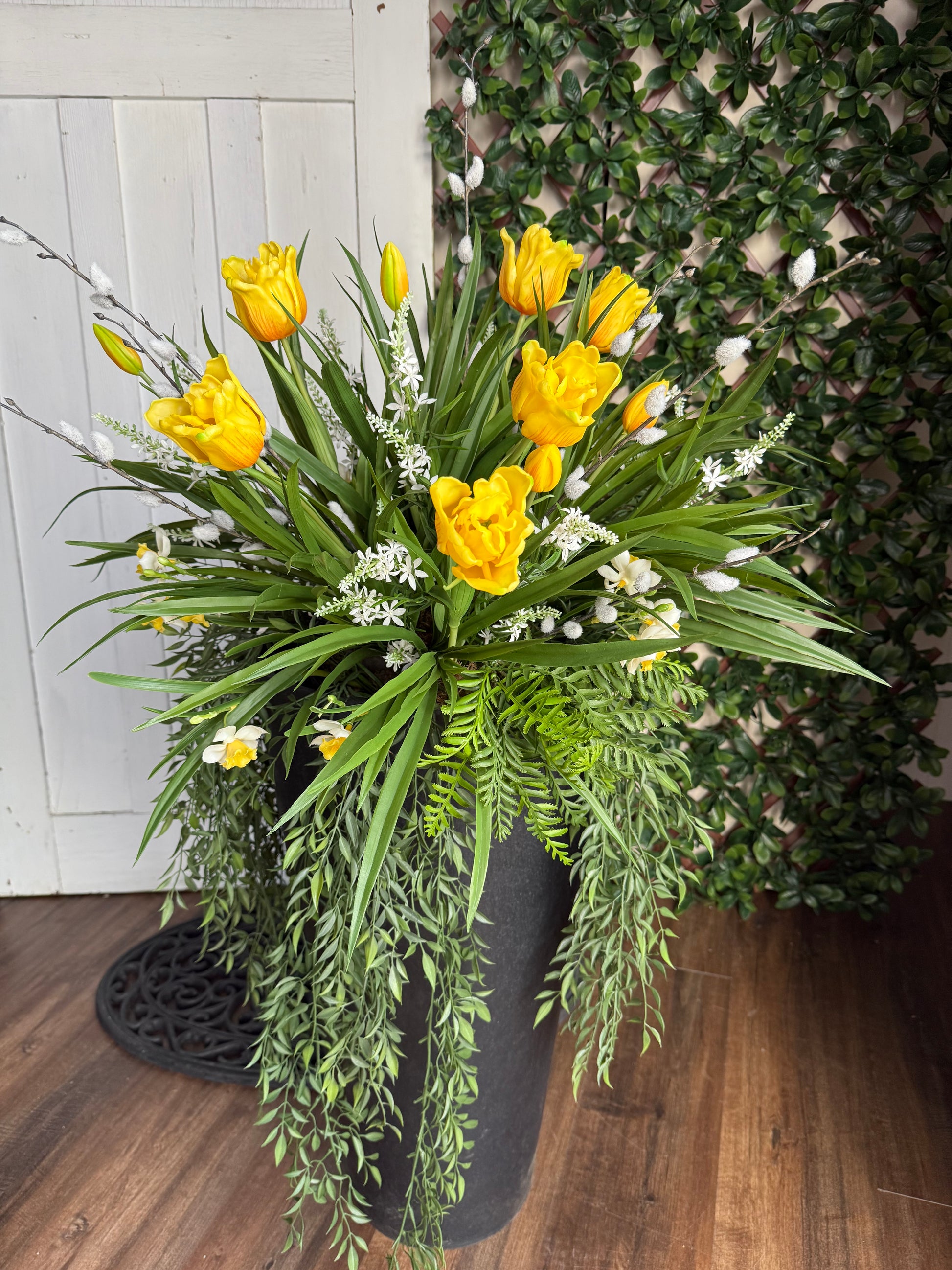 The Tulip Planter Insert measures 26 x 20 inches and features realistic faux tulips, grass, and wildflowers. Designed to fit into your existing planter, it includes a 10-inch plastic liner pot, making it ideal for enhancing spring porch decor with minimal maintenance.